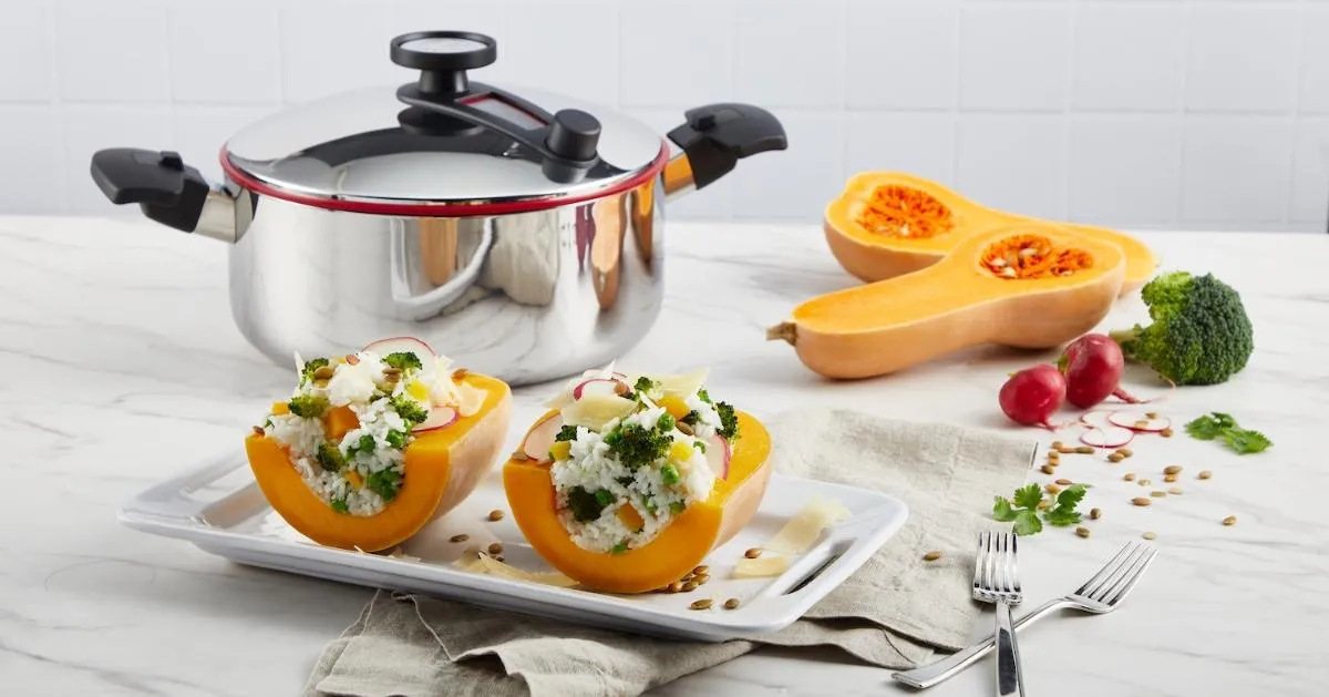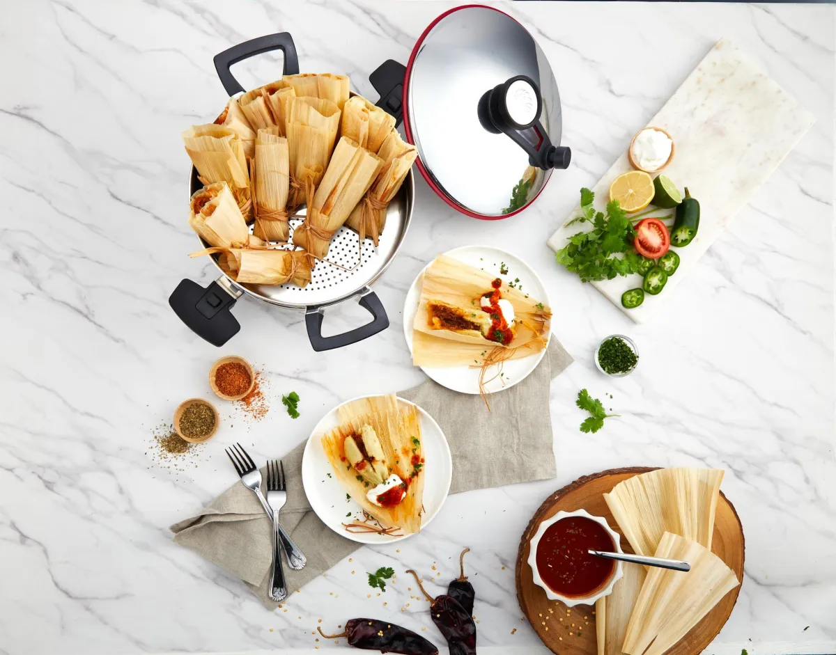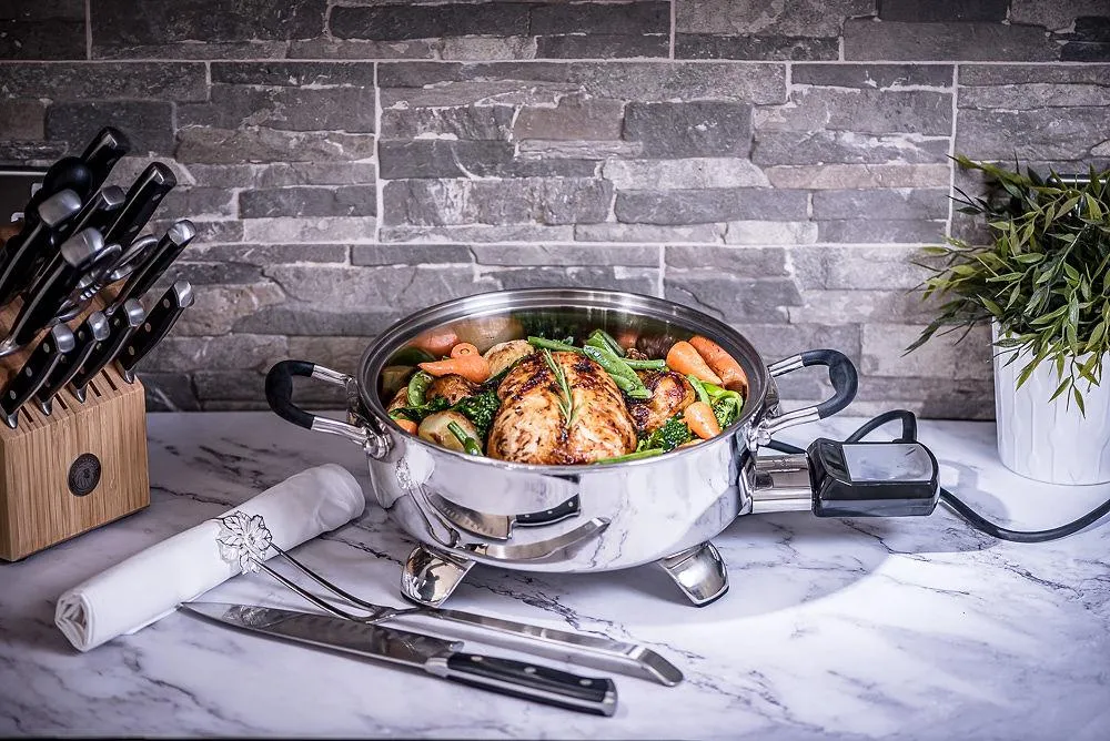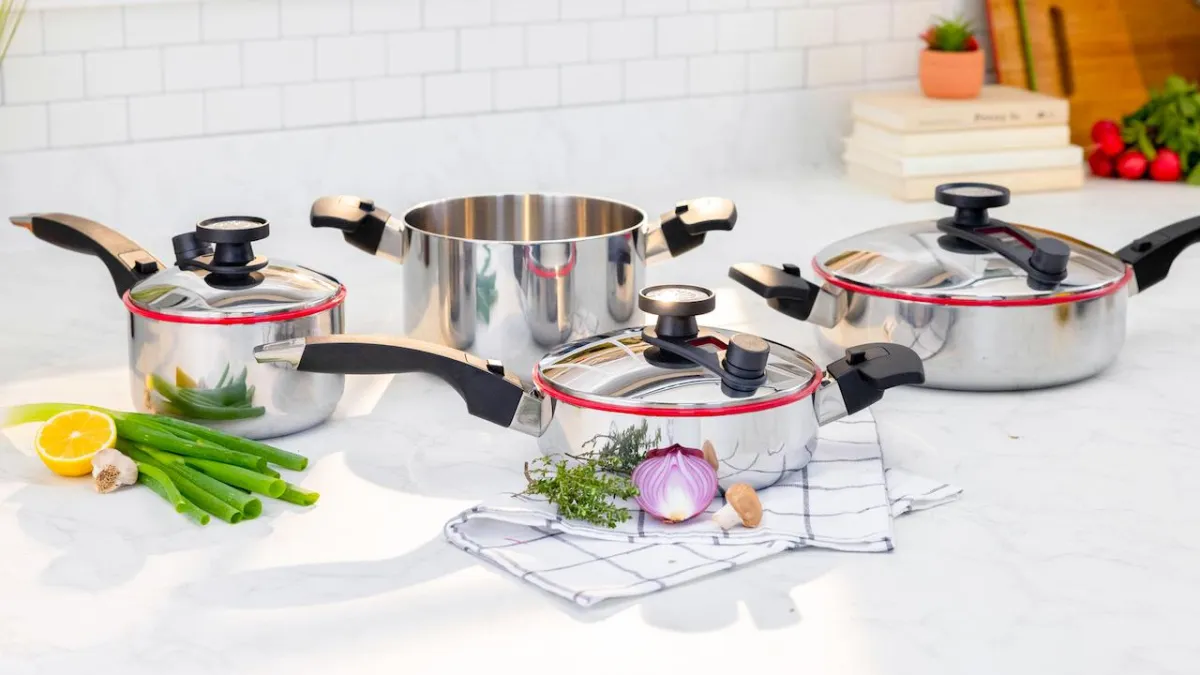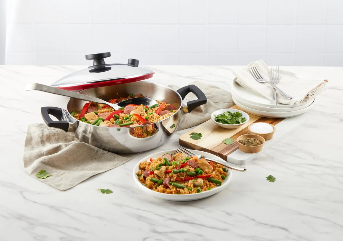 Waterless cooking in Innove uses the cookware’s vapor-seal technology to trap steam, allowing food to cook in its natural moisture, preserving flavors, nutrients, and requiring no added oils or fats.